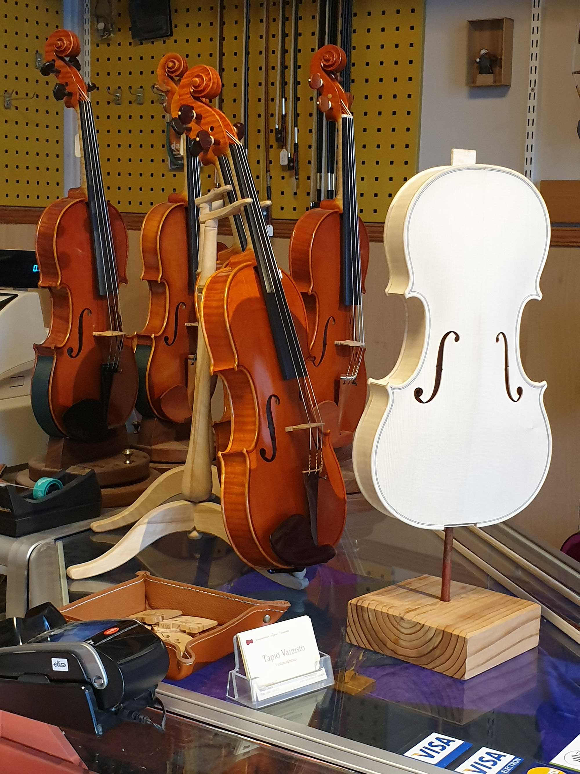 Myytävänä on myös kaikkien jousisoittimien kieliä, tarvikeosia ja soitinkoteloita.